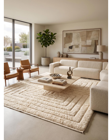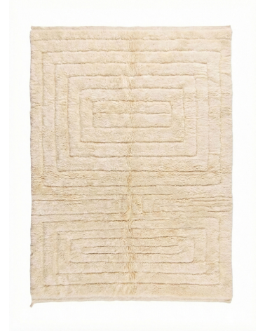 Elevate your home with this authentic, handwoven Ecru Moroccan Mrirt rug. Featuring ultra-plush wool and a stunning 3D carved geometric pattern, perfect for modern minimalist decor.