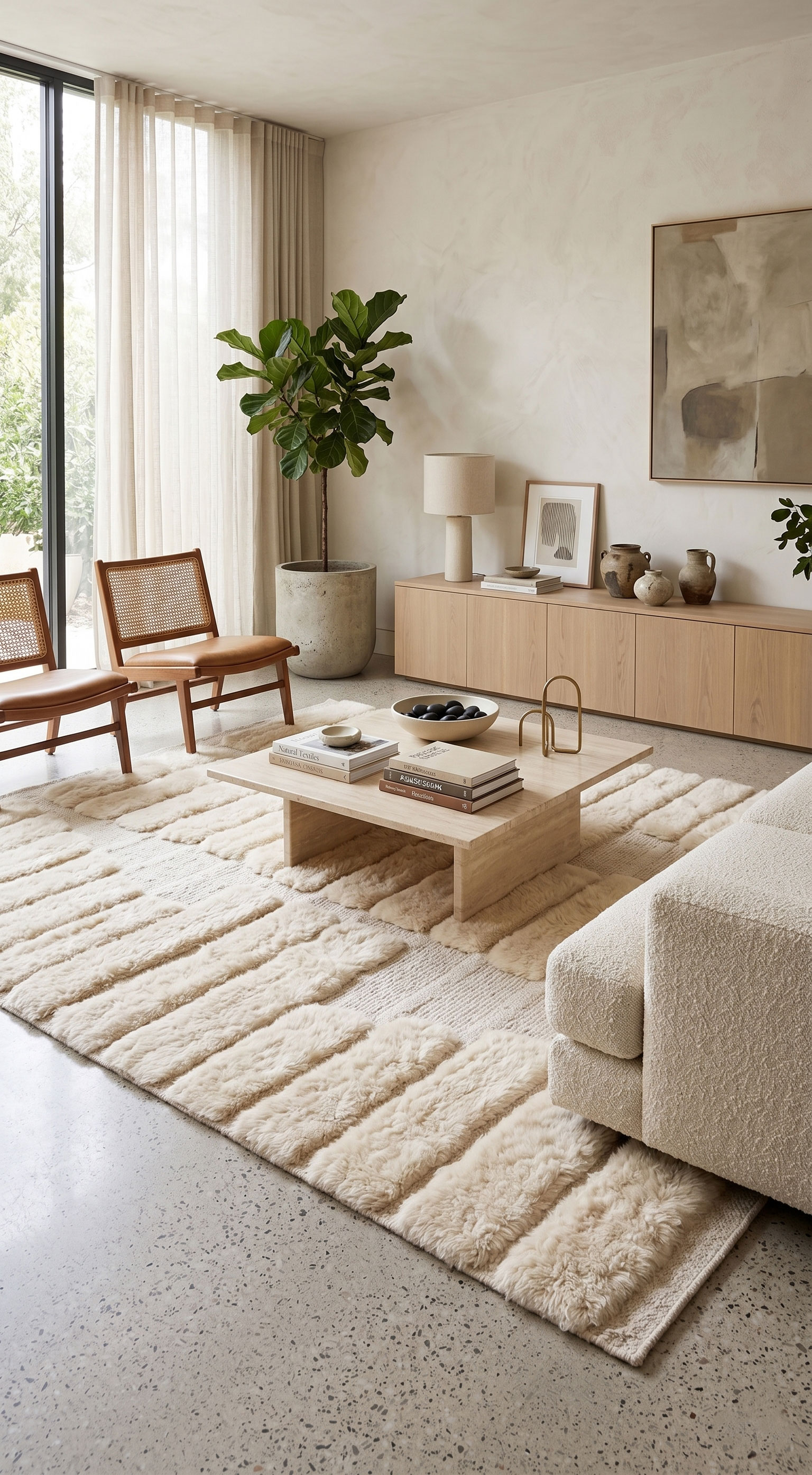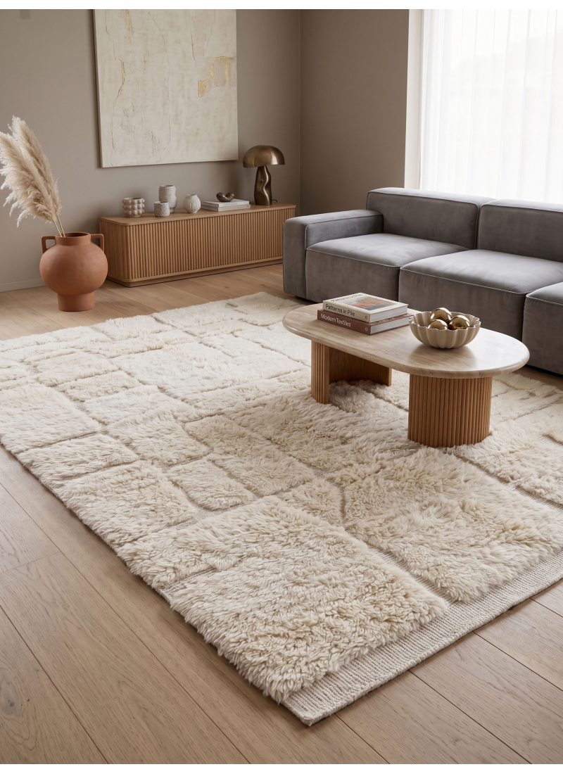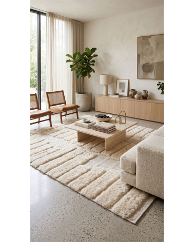 Elevate your space with this authentic, handwoven Ecru Moroccan Mrirt rug. Featuring a striking 3D carved stepped ribbed pattern in plush natural wool for a sophisticated minimalist aesthetic.