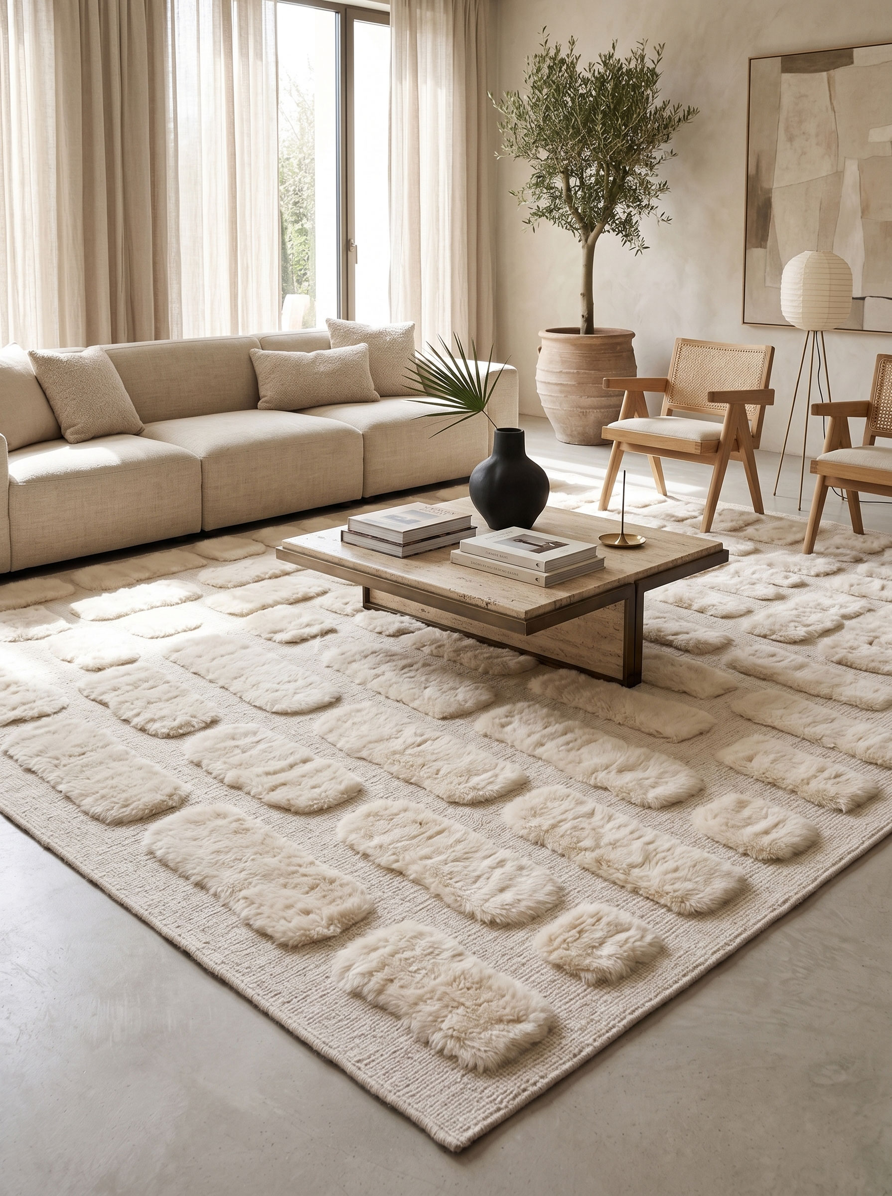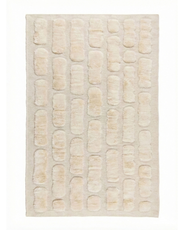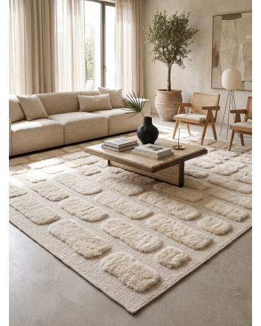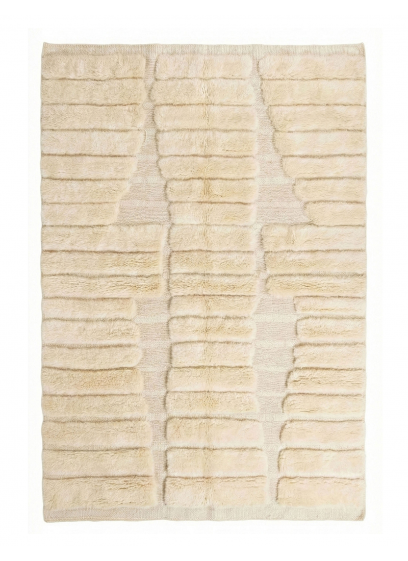 Elevate your space with this authentic, handwoven Ecru Moroccan Mrirt rug. Featuring a striking 3D carved oblong block pattern in plush natural wool for a highly tactile, modern aesthetic.
