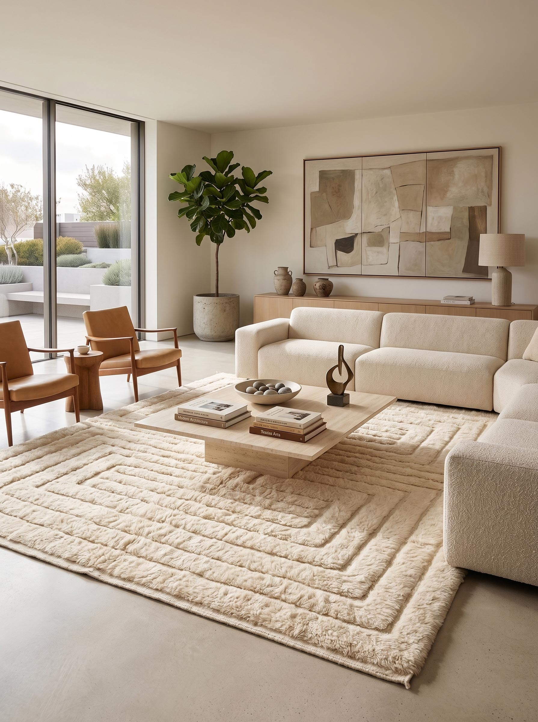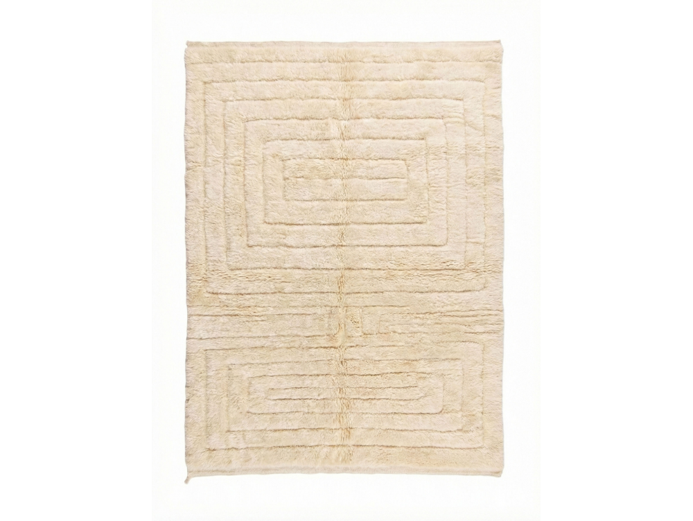 Sublimez votre intérieur avec ce tapis Mrirt marocain écru authentique, tissé à la main. Confectionné en laine ultra-douce et orné d'un superbe motif géométrique sculpté en 3D, il s'intègre parfaitement dans une décoration minimaliste et moderne.