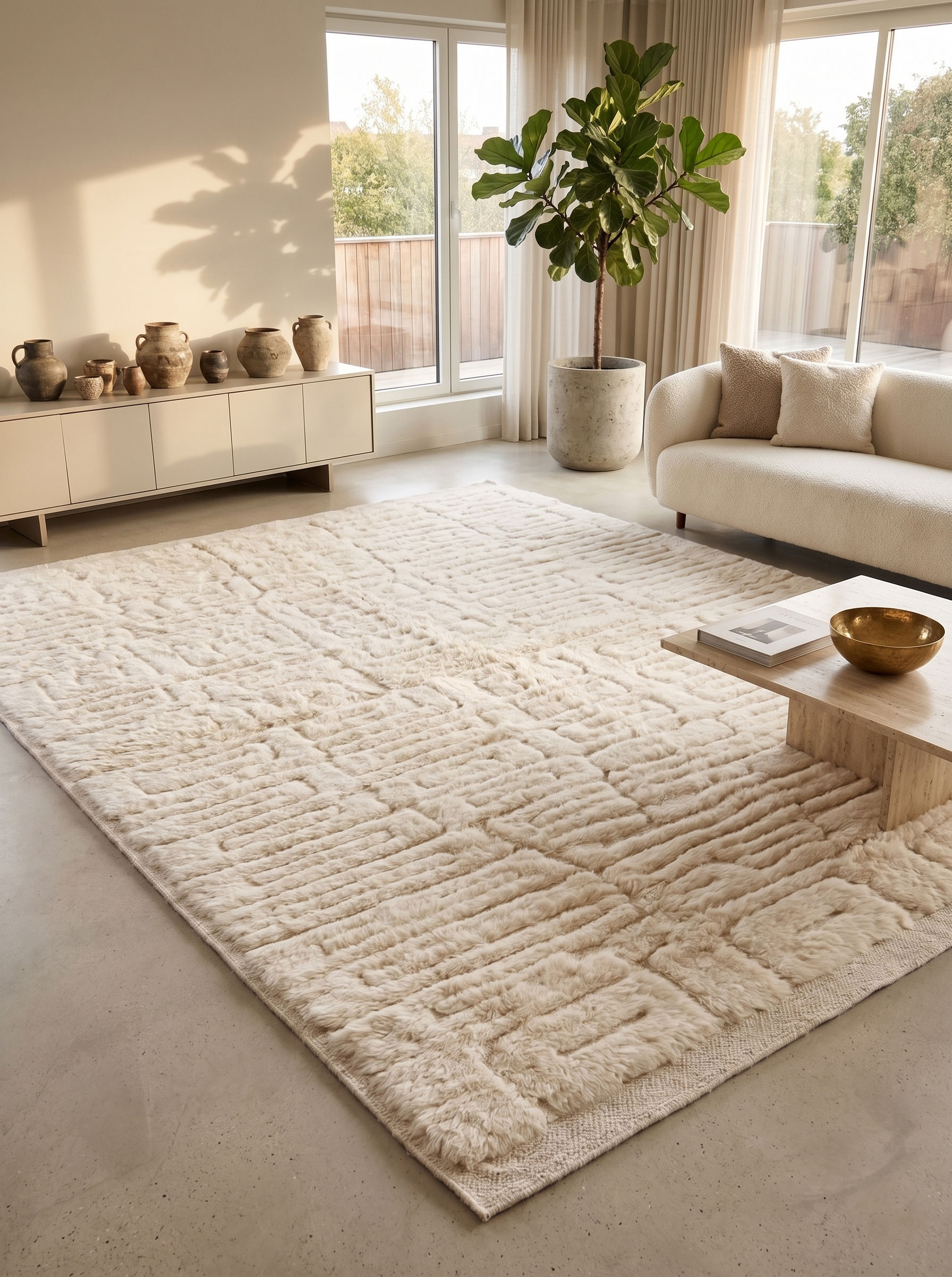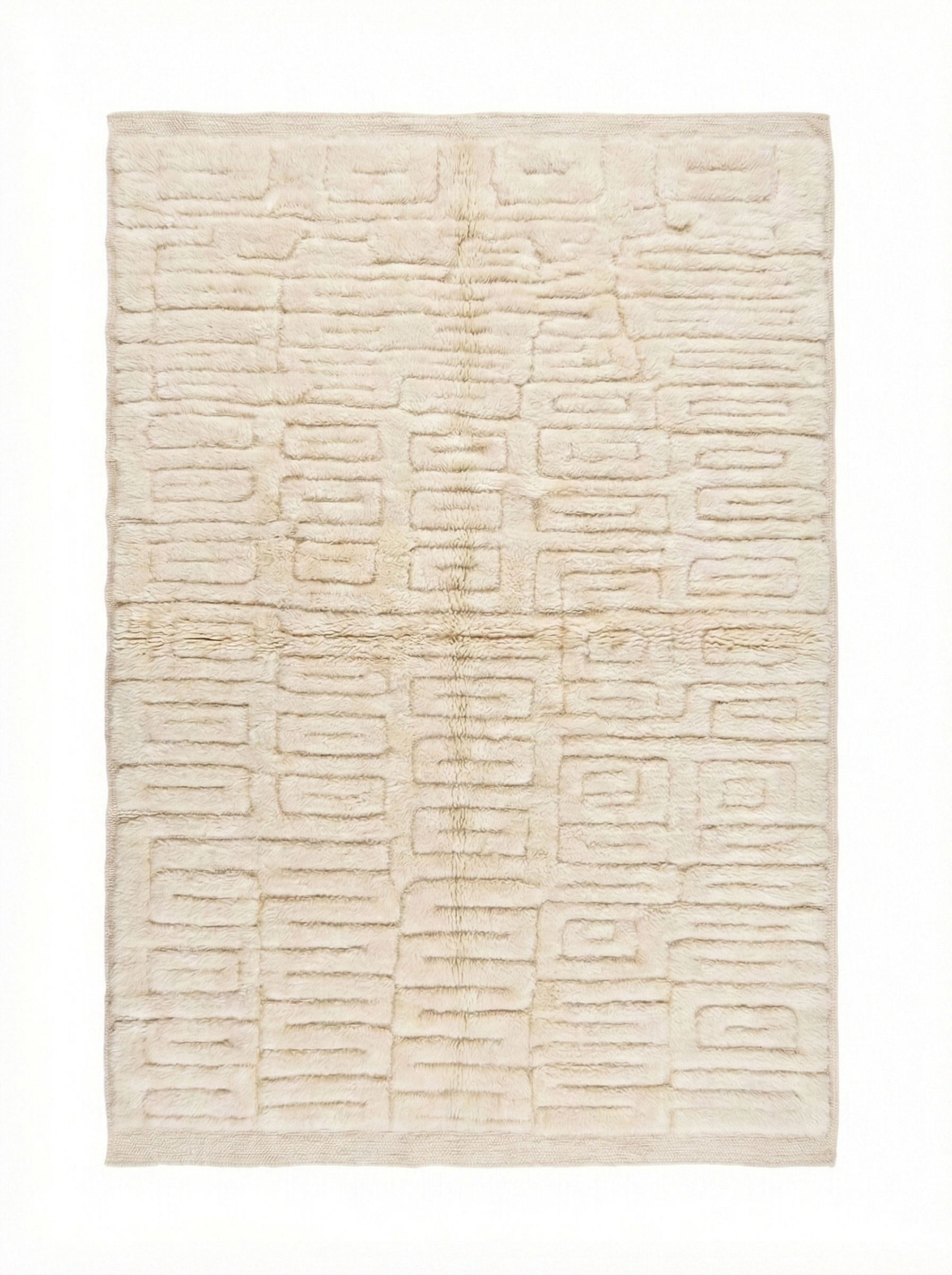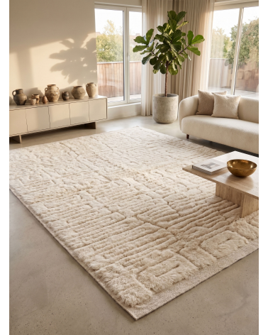 Tapis berbère Mrirt crème minimaliste moderne | Motif labyrinthe sculpté en 3D